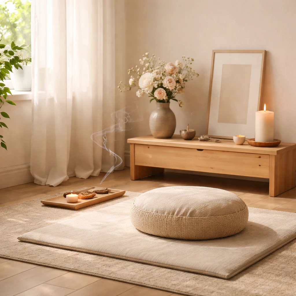 Для медитации дома важно выделить собственный угол в комнате — чистый и ухоженный, воспринимаемый как личное место тишины. Это пространство используют только для практики: так мозг быстрее связывает его с состоянием сосредоточенности. В таком уголке можно поставить небольшой алтарь: например, портрет духовного учителя, Христа или другого близкого вам духовного образа, который воспринимается как ориентир.