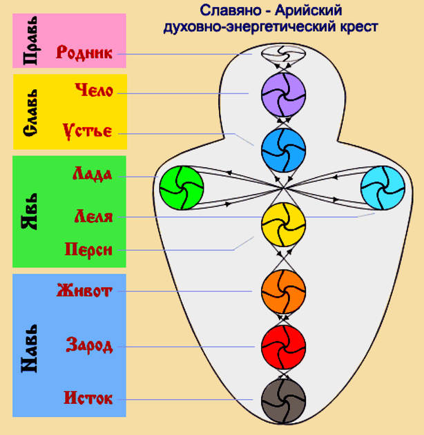 Интересно было узнать, что у наших предков, Славян, также было довольно подробно описано строение человека на энергетическом уровне. Каждая чакра имеет своё "древне-русское" название, которое поясняется её предназначением.
